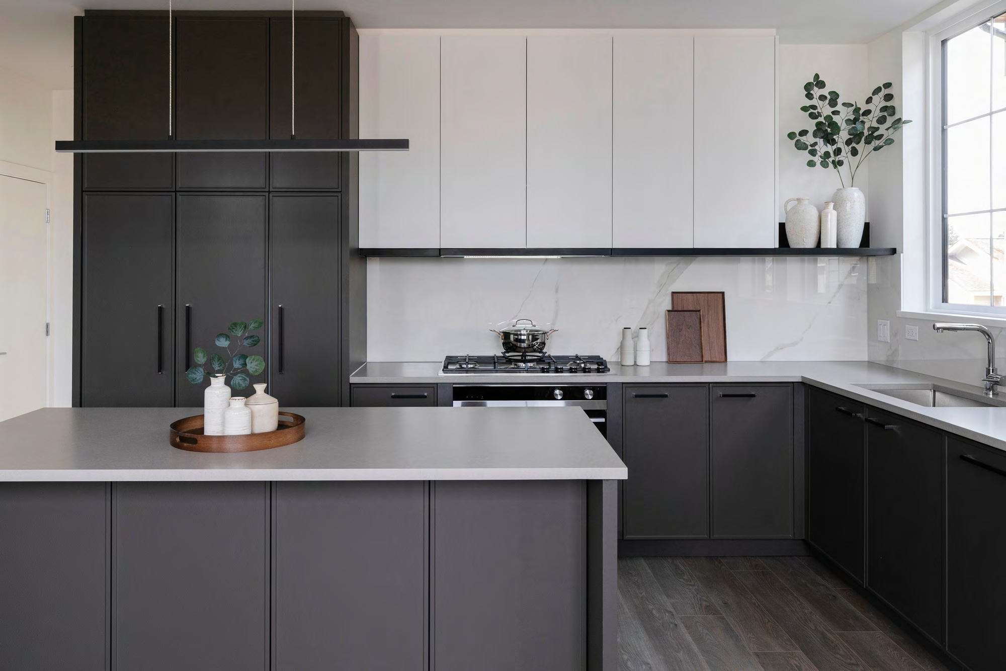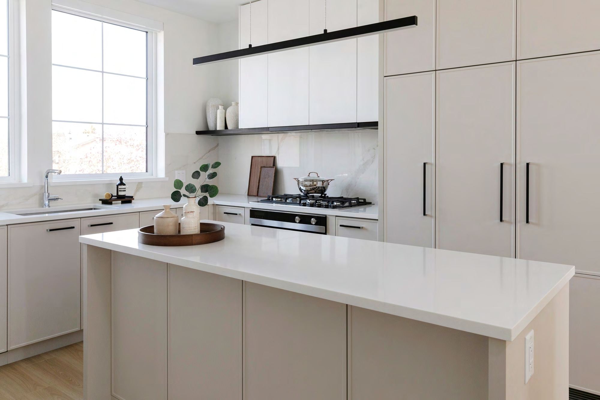 4. 厨房采用定制Shaker风格橱柜,搭配橱下照明和缓冲开关,同时安装有石英石台面搭配瓷砖防溅背板,整体搭配哑光黑色五金件,尽显质感;