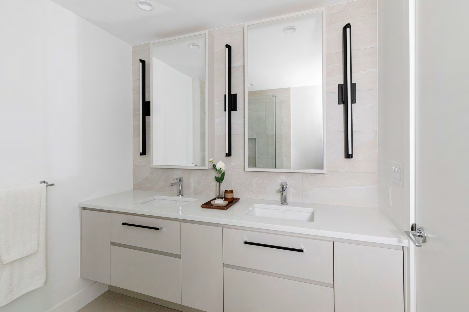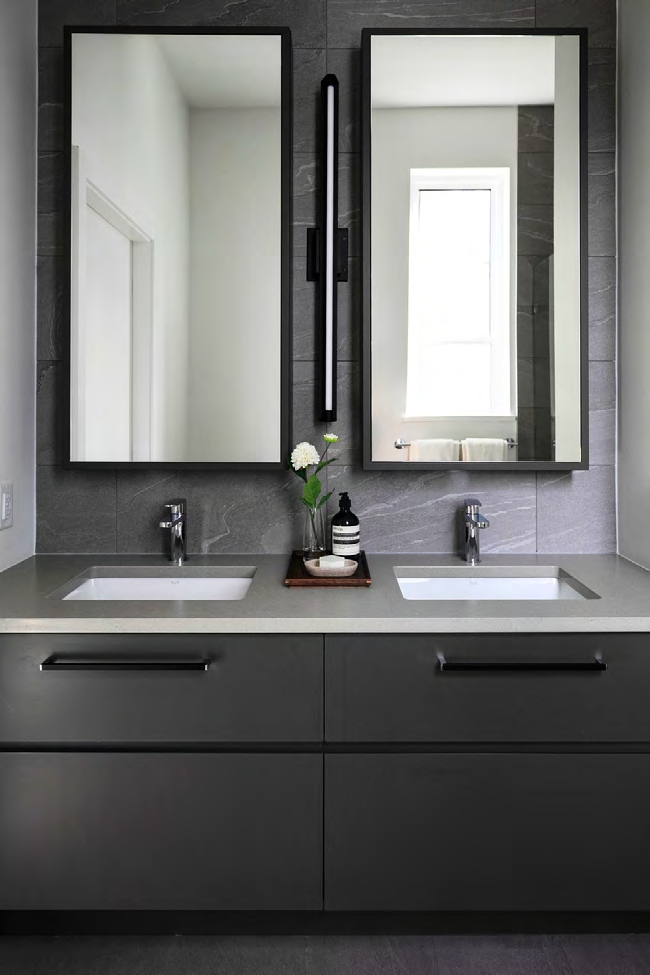 6. 卫生间内铺设大尺寸瓷砖,配备悬浮式梳洗台与镜面药柜,收纳空间充足,主卧套间卫生间内安装有无缝玻璃淋浴间,主卫则为浸入式浴缸。